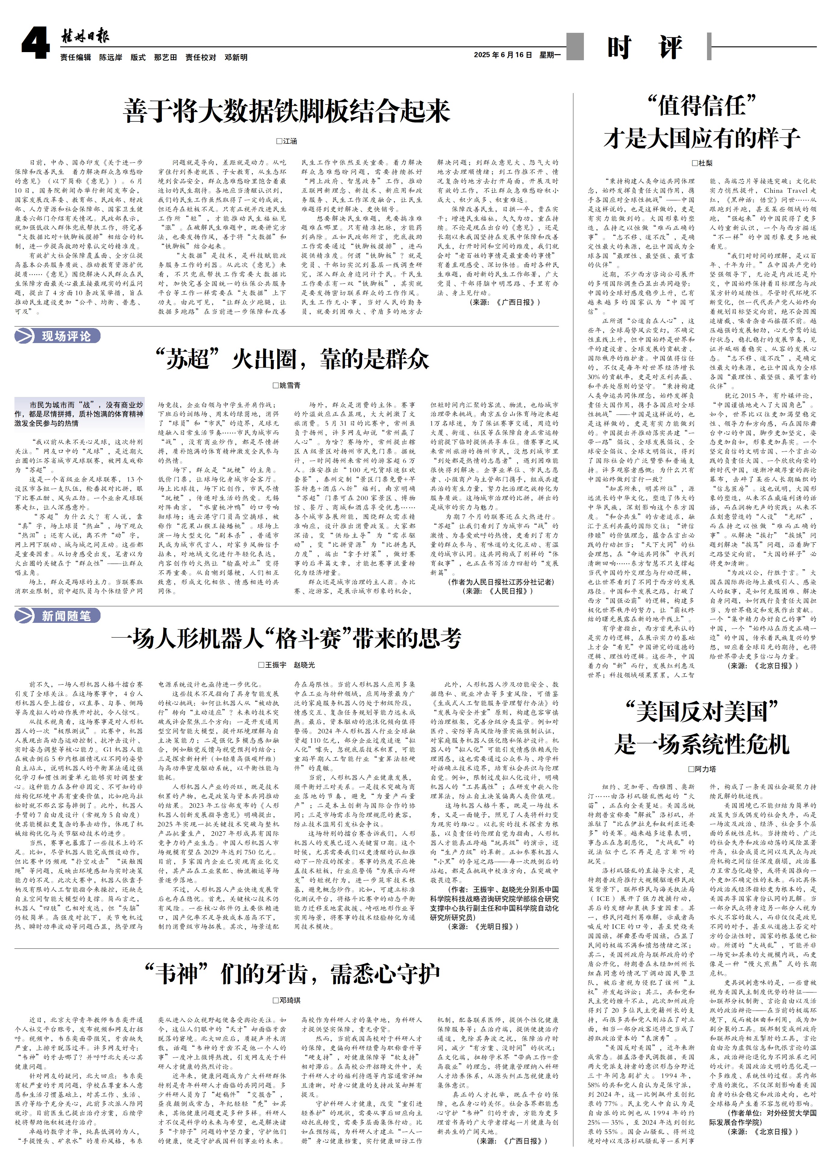 群众还是城市治理的主人翁。办比赛、迎游客,是展示城市形象的机会,但短时间内汇聚的客流、物流,也给城市治理带来挑战。南京五台山体育场迎来超1万名球迷,为了保证赛事交通,周边的大厦、街道、社区等在保障自身正常运转的前提下临时提供共享车位。借赛事之风来常州旅游的扬州市民,没想到城市里“到处都是热情的志愿者”,遇到困难能很快得到解决。企事业单位、市民志愿者、小微商户与主管部门携手,组成共建共治的有生力量,努力把治理之效转化为服务质效。这场城市治理的比拼,拼出的是城市的实力与魅力。