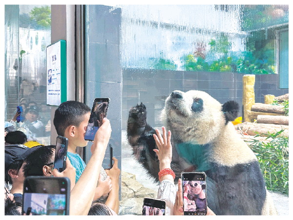 6月15日,市民、游客在温州动物园熊猫馆观看、拍摄大熊猫。