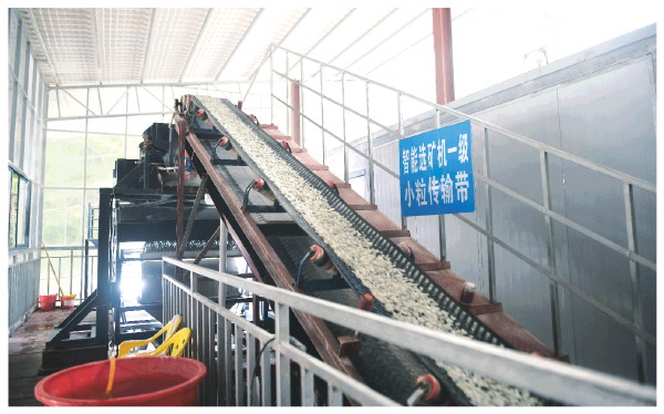 小颗粒矿石通过传输带送进AI分选机,完成精矿和废料的筛选。