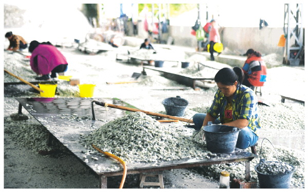 选矿厂的人工选矿区,分选工人正在选矿石。