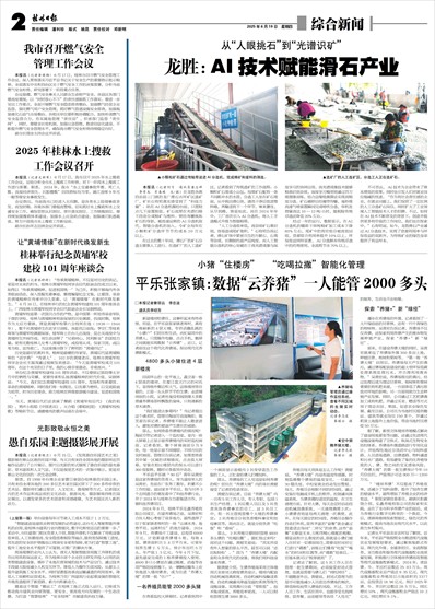 探索“养猪+”新“绿径” 漫步在养猪场的外围,记者看到了一大片绿油油的甘蔗林,还有一片片青绿色的桉树林。吴黄宏告诉记者,养猪场不仅仅养猪,还探索利用养猪产生的废弃物发展种植产业,探索“养猪+”新“绿径”。 原来,在建设养猪大楼的同时,吴黄宏就承包了养猪场外围300多亩土地,种植甘蔗、桉树和果树等。“第一栋‘养猪大楼’启用后,养猪场每天产生的粪污,通过猪场配套建设的超大型环保低碳处理系统处理污水,并合理利用废弃物。”吴黄宏说,养猪场排出的粪污,经过处理后成为周边甘蔗林、桉树林和果树重要的有机肥来源,一方面降低了粪污排放对环境的影响,另一方面则助力生态种植产业发展。同时,公司通过工艺把猪粪加工成有机肥,并通过买卖、赠送等方式用于周边农田、果园,促进农业绿色发展。截至目前,公司共为当地村民提供搬运、建筑等就业岗位150多个,并通过租赁土地提升土地价值,带动当地村民增收50万元。 据了解,新型立体楼房养殖模式解决了建设用地紧张等问题,还通过先进现代设施设备构建了立体式、纵深式生物安全防控体系。养猪场外围道路进行专用化设计,并结构性地区分洗消中心与饲料道路、人员进场道路、出猪道路、物料通道和污水厂道路,有效避免了集约化养殖导致的人、猪、物之间的交叉感染风险。“养猪大楼”的第一批生猪预计今年10月份出栏,产值预计可达900万—1200万元。 “‘楼房养猪’不仅提高了养殖效率,还减少了饲料浪费,提升了饲养生猪的健康水平,最终增加了养殖企业的经济效益。”据张家镇党委委员、副镇长彭露饶介绍,弘鑫养殖有限公司的探索和实践,走在了全市科学养猪产业的前沿,成为养殖行业数字化转型的一个典范。今后,该镇将继续探索智能化、绿色化的养殖模式,提高当地农业现代化水平,以此助力乡村振兴。 记者从平乐县农业农村局了解到,近年来,平乐县严格按照全市推进现代设施农业发展规划要求,通过聚焦集群式布局、现代化升级、全链条招引、全流程服务,全力推动和服务现代设施畜牧业高质量发展,积极推行立体楼房养猪高效智能等现代设施畜牧新模式。2024年,该县猪、牛、羊出栏总数达25.83万头,现代设施畜牧业总产值达9.35亿元,现代设施畜牧业养殖项目占地面积约3377亩,总投资达18.96亿元。预计2025年猪、牛、羊出栏总数达28.5万头,同比增长10%,现代设施畜牧业产值达10.2亿元,同比增长9.1%。