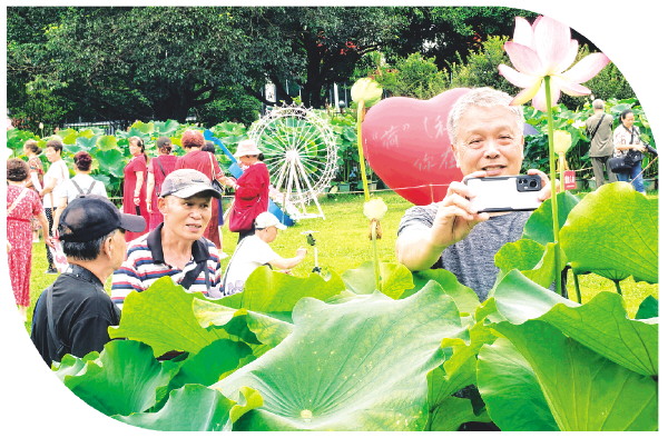 当天上午,记者来到西山公园,看到在龙池景点里种植的、大草坪上摆放的各品种荷花或含苞待放,或舒展盛开,美不胜收。清风徐来,阵阵荷香让人神清气爽,荷花的美丽高洁让人感受到生活之美,体会到岁月静好。在荷花花海中,设置有铁艺大提琴、摩天轮、动漫雕塑等造型,以及融入古典诗词绘画的竹制景观,增添了一些现代感与生活气息。盛开的荷花吸引了不少市民、游客前来观赏,大家拿着相机、手机穿梭在花海中,选择最佳角度留影。另外,西湖里种植的荷花也在陆续绽放中。