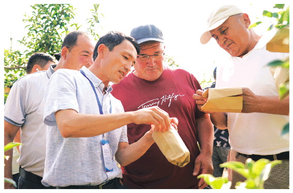 6月16日,培训班学员在位于陕西省渭南市白水县的西北农林科技大学苹果试验站了解苹果套袋知识。