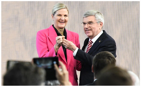 6月23日,柯丝蒂·考文垂(左)从托马斯·巴赫手中接过“奥林匹克之家”的钥匙。