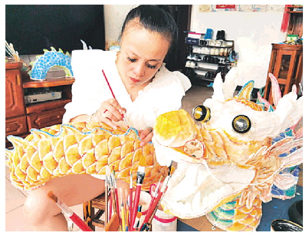 图④:谢文华正在悉心打理赤、橙、黄、绿、蓝五条板凳龙。记者蒋璇 摄