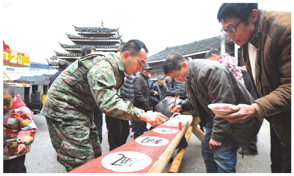 ▲3月的动工仪式上,德高望重的寨老为梁木写上“风调雨顺”四个字。