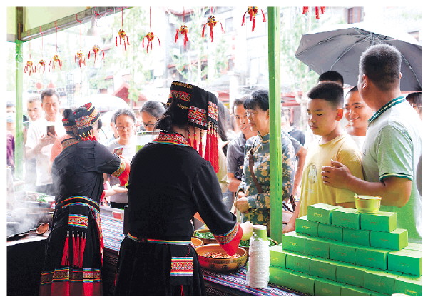 ▲第十五届“桂林经典·恭城油茶”文化活动周期间,游客在油茶体验区免费品尝恭城油茶。 费丽 摄