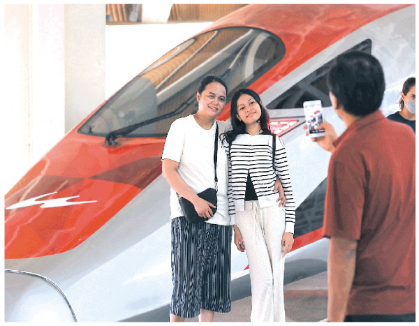 6月19日,在印度尼西亚雅加达哈利姆站站台,两名乘客与雅万高铁高速动车组列车合影。 新华社记者岑云鹏 摄