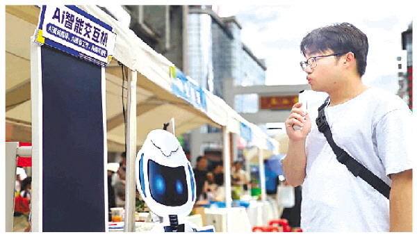 求职者正在体验AI智能交互机的各种功能。 记者韦莎妮娜 摄