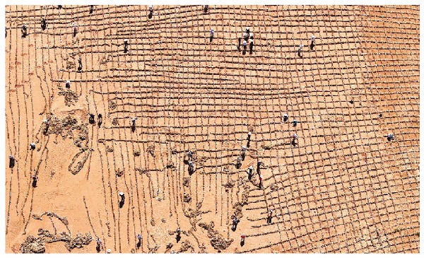 这是6月30日在宁夏中卫市长流水村拍摄的腾格里沙漠东南缘治沙锁边工程现场(无人机照片)。 新华社记者王鹏 摄
