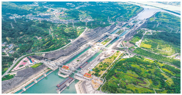7月2日,在湖北省宜昌市,船舶有序通过三峡枢纽(无人机照片)。