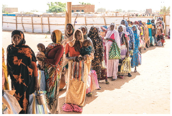 6月25日,在乍得东部的阿德雷难民营,苏丹难民排队领取救济物资。