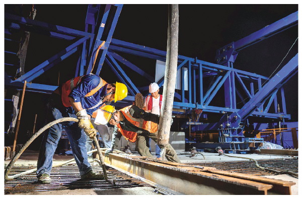 7月6日凌晨,在邵永高铁跨S236省道大桥施工现场,中铁五局工人进行连续梁合龙施工。当日,在湖南省永州市东安县芦洪市镇,邵永高铁全线首座连续梁——跨S236省道大桥连续梁成功合龙。