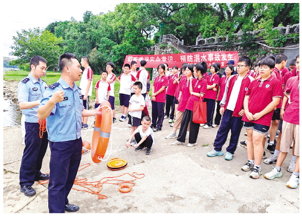 本报讯(记者陈静 通讯员周长辉 杨柳)“瞄准目标!发力!抛出!”近日,在漓江解放桥段,一声声清脆的口令伴随着孩子们专注的练习此起彼伏。这不是普通的游戏场景,而是桂林市公安局白龙派出所联合解东社区、秀峰社区卫生服务中心,为辖区青少年精心打造的沉浸式防溺水实战训练营现场。随着暑假来临,孩子们到江河边玩水的概率增加,溺水风险陡增。这堂在真实水域边开展的防溺水教育课,旨在让孩子们在亲身体验中掌握关键时刻自救与互救的“真功夫”。 如何让防溺水教育告别枯燥说教,真正入脑入心?秀峰公安的答案是:走出教室,直抵水岸。社区民警唐卓琰化身“安全讲师”,一开场就用“私自下水野泳有多危险”“同伴落水如何施救”等关键问题抓住孩子们的心。结合漓江水域特点和真实案例,民警剖析溺水危害,向孩子们系统传授“防溺水六不准”等核心知识,让“安全第一”的理念在他们心中扎根。理论学习结束后,民警和社区人员带领孩子们来到紧邻社区的漓江岸边,将这片熟悉的水域变为“天然实景训练场”。 面对波光粼粼的江水,实战环节展开。医护人员手把手指导孩子们进行心肺复苏操作,民警则重点教授岸上救援技巧。“看水流方向,工具一定要抛向落水者上游!”民警详细讲解水流判断诀窍、抛投救生工具要领和应保持的安全距离。随后,孩子们在民警一对一保护下,分组进行救生圈抛投“实战考核”,在反复的练习中,孩子们的抛投精准度与安全意识同步提升。“记住!自身安全第一!量力而行,智慧施救!”民警全程强调铁律。 “就在天天路过的漓江边学防溺水知识,民警、医生教得实在,孩子们练得投入。这种‘实战’经验在书本上学不到,印象太深刻了!”陪孩子一起参加活动的家长李先生表示。 “依托漓江真实场景开展防溺水教育,效果更直观、警示更深刻、技能掌握得更牢固。”白龙派出所所长张坤说道。 这堂“漓江边的实战课”,正是秀峰公安分局系统性筑牢青少年防溺水安全防线的缩影。今年以来,秀峰分局不断深化“主动警务、预防警务”,系统推进防溺水安全工作,统筹警力及教育、街道、志愿者等方面力量,在重点水域、学校、社区开展防溺水宣教活动120场次,覆盖2万余人次,形式从课堂宣讲到实战演练多元化开展,并配备无人机进行常态化空中巡查,结合派出所民警、社区网格员和“红袖标”志愿者的地面力量,织密“空天地”一体化立体防控网络,实现对重点水域24小时动态监控与险情快速响应。分局还大力推动设施保障与应急前置举措,在辖区26处重点水域推进危险水域“四个一”(一块警示牌、一个救生圈、一根救生绳、一对救生杆)建设工作,配备救生设备26套,确保救援物资触手可及。同时,牵头建立街道、社区、学校、文旅、水利等部门联席会议机制,压实责任、联动响应,构建“党委领导、部门协作、社会参与、家校联防”大格局。