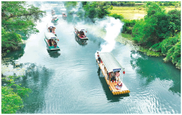 模特及市民游客乘坐竹筏在海菜花湿地河面漂流。 记者李忠波 摄
