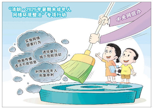 当暑期的蝉鸣与键盘敲击声交织,中央网信办“清朗·2025年暑期未成年人网络环境整治”专项行动的部署,为躁动的网络空间安装了“净化滤镜”。这场为期两个月的专项治理,既是对《未成年人网络保护条例》的刚性落实,更是对亿万家庭期盼清朗网络生态的及时回应。(7月15日 人民日报客户端)