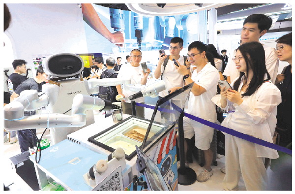 7月29日,一个服务机器人在向参观者演示制作冰激凌球。