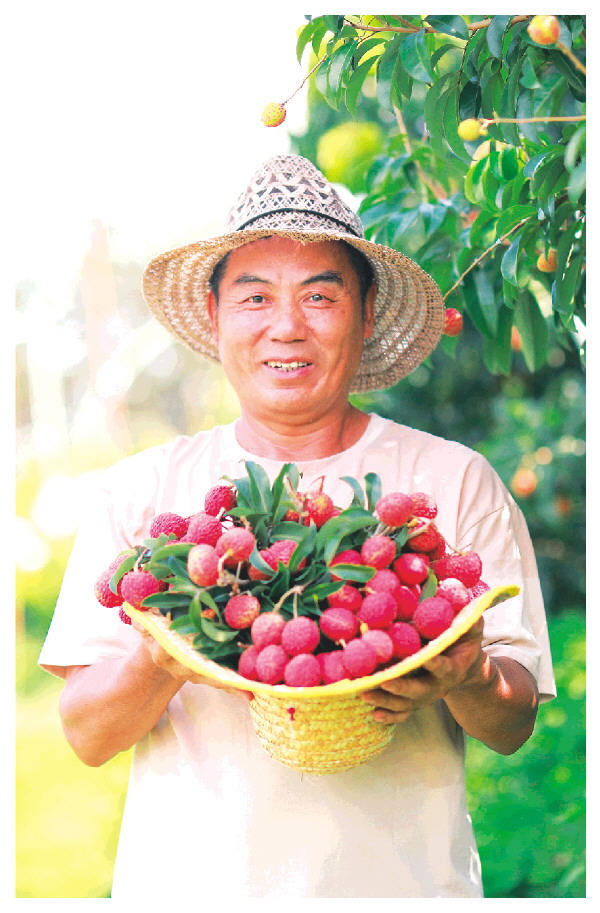 赵勇捧着刚采摘下来的新鲜荔枝。