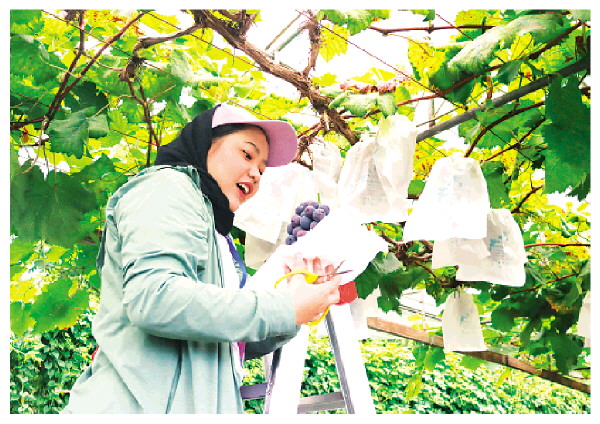 一名印尼留学生在资源县中峰镇的葡萄园体验采摘葡萄。 夏秋圆 摄
