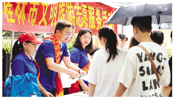 现场发放清凉礼包,开展政策普法、文明宣传等,让导游们深切感受到了行业协会及社会各界的支持与关爱。 (市导游协会供图)