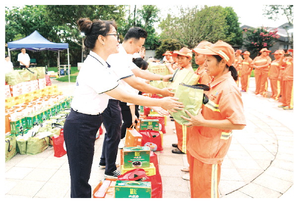 慰问组向环卫工人发放绿豆、凉茶等消暑慰问品。(新城投集团供图)