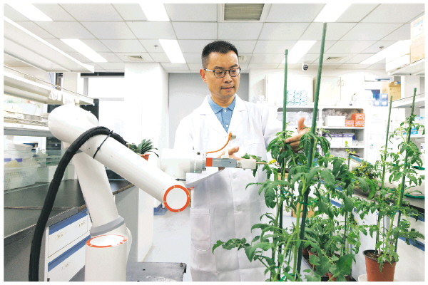 8月12日,在中国科学院遗传与发育生物学研究所实验室,许操研究员在观察智能育种机器人“吉儿”的工作情况。 新华社记者金立旺 摄