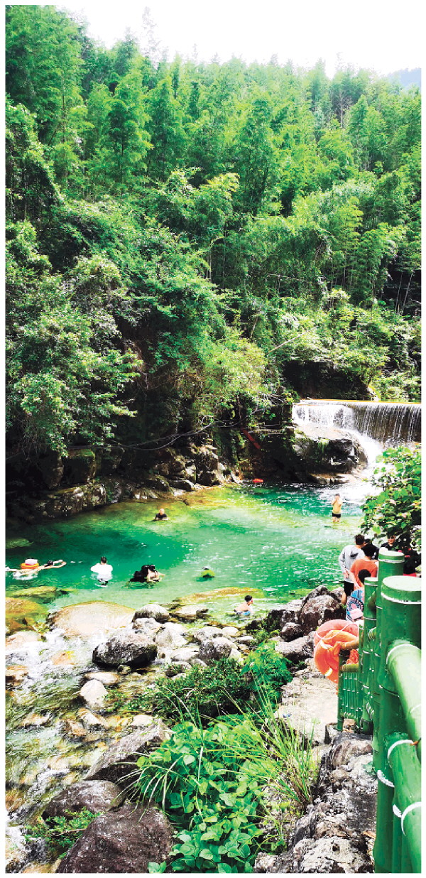 这里的水潭都清澈、透亮,深的地方幽蓝,浅的地方是淡淡的蓝绿色,被人们称为“果冻水”。它带来视觉上的冲击和美感,让人忍不住想和它亲密接触。而接触的方式有很多——静静观赏,在它边上喝茶,还顺带听风声、水声、竹林声,扎入水中,感受它的清凉……