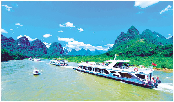 秀美的漓江像一条绿丝带,蜿蜒曲折穿过桂林,盘绕在万点峰峦之间,形成“百里漓江,百里画廊”。8月23日,游客搭乘游船畅游漓江,领略美丽的漓江山水风光。