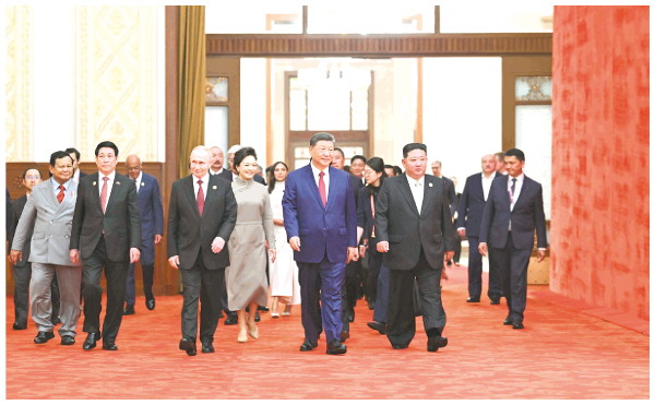 ▲9月3日,纪念中国人民抗日战争暨世界反法西斯战争胜利80周年招待会在北京人民大会堂隆重举行。中共中央总书记、国家主席、中央军委主席习近平出席招待会并发表重要讲话。这是习近平和夫人彭丽媛同出席招待会的外国领导人夫妇共同步入宴会厅。 新华社记者谢环驰 摄