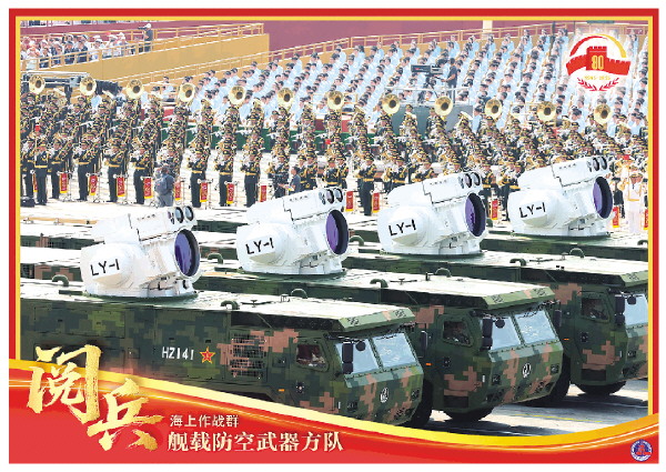 ▲海天盾牌,御敌铠甲。由2台引导车、16辆运输车组成的舰载防空武器方队,3日上午光荣接受检阅。