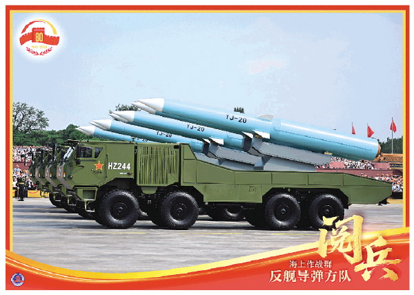 ▲鹰击出鞘,叱咤海空。由2台引导车、16台运载车组成的反舰导弹方队,3日上午通过天安门广场,接受祖国和人民检阅。