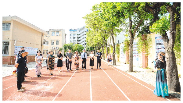 在校园红领巾讲解员引领下,与会领导嘉宾参观校史墙。蒋林珠 摄