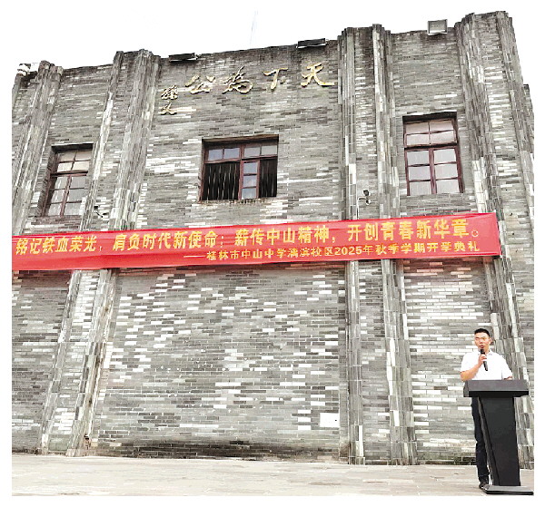 开学第一天,桂林市中山中学初中部以“铭记铁血荣光,肩负时代新使命;薪传中山精神,开创青春新华章”为主题,举行2025年秋季学期开学典礼。