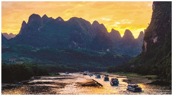◤10月5日傍晚,漓江九马画山段,晚霞的余晖铺洒在漓江之上,几艘游船经过,江面泛起金色涟漪,美景如画。