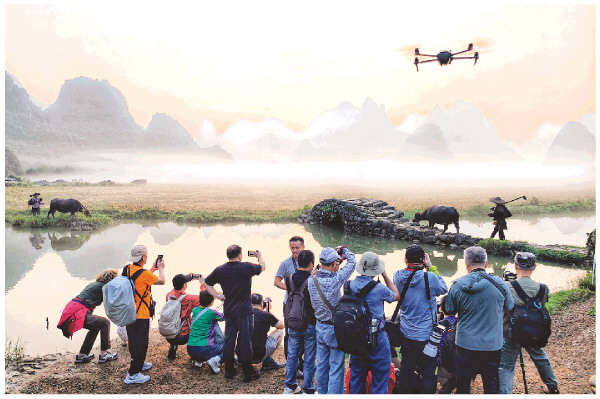 ◤10月10日一早,在临桂区四塘镇田心村状元桥上,模特傍牛行走,和远处的晨雾成为了摄影爱好者聚焦的中心。