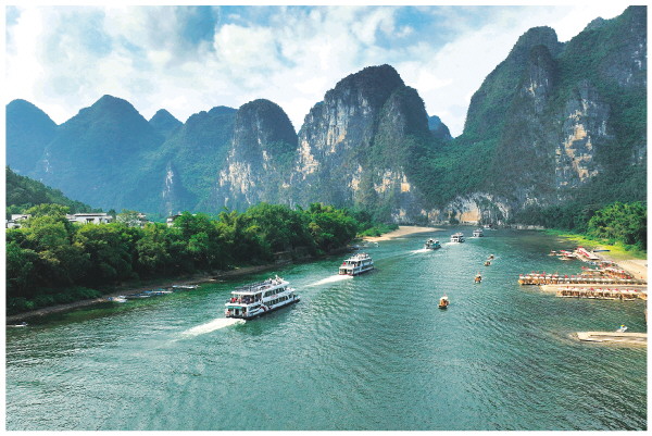 一江碧水蜿蜒,漓江两岸青山叠翠、生机勃勃。桂林的优美山水和良好生态,吸引了国内外游客慕名而来。图为今年国庆、中秋假期,游客乘坐游船在漓江游览。 记者李忠波 摄