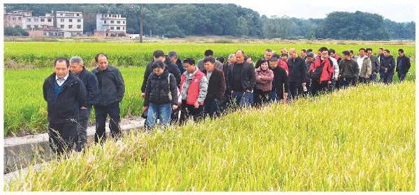 本报讯(记者李忠波 通讯员邓琳 沈昊)金秋十月,稻浪翻滚。10月23日,“桂北粮仓”全州县在禾美稻香现代农业核心示范区举办水稻高产攻关示范片创建现场观摩会,县农业农村局相关人员、18个乡镇农业服务中心主任及种粮大户代表等60余人参会。此次活动是该县落实国家千亿斤粮食产能提升行动、推进2025年水稻高产攻关的重要举措。