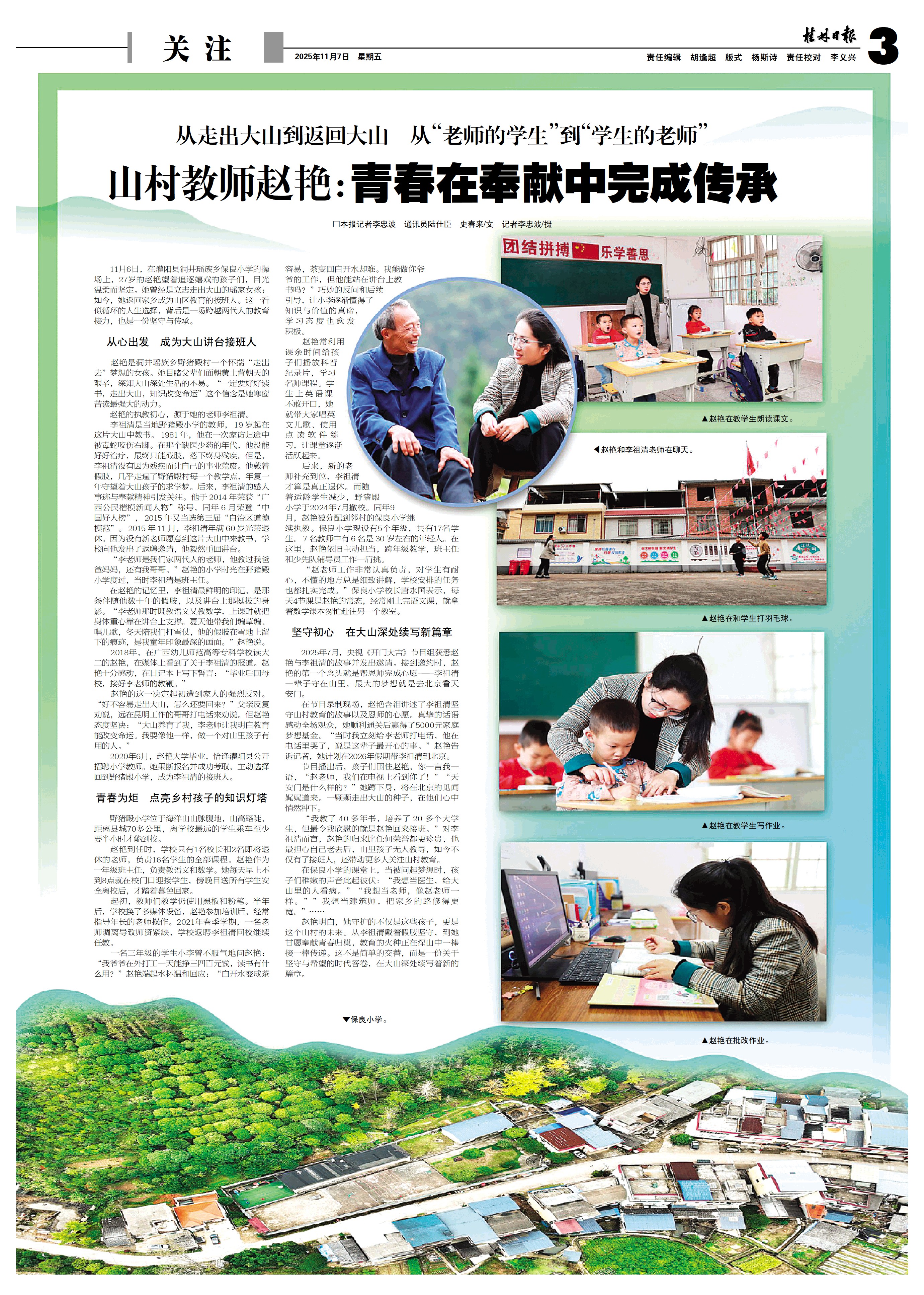 11月6日,在灌阳县洞井瑶族乡保良小学的操场上,27岁的赵艳望着追逐嬉戏的孩子们,目光温柔而坚定。她曾经是立志走出大山的瑶家女孩;如今,她返回家乡成为山区教育的接班人。这一看似循环的人生选择,背后是一场跨越两代人的教育接力,也是一份坚守与传承。