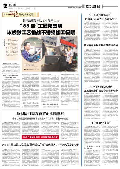 感悟:在传承中持续创新 这次关于提高数控车床加工不锈钢盘类零件表面精度的技术创新,只是近年来阳玉明在技术攻关上的缩影。在他看来,他只是做了自己应该做的。“在我们制造行业,还有很多工匠在技术创新上做了很多成绩,为我们行业的发展提供了不断前进的技术动力,我应该向他们多多学习。” 如今获得“桂林工匠”认定,阳玉明表示,这是荣誉,更是激励,他将继续在技术创新上发挥自己的优势。“不仅要进一步完善现有创新技术,提高其稳定性和可靠性,使其能够更好地应用于实际生产中,还要密切关注行业最新发展动态,不断学习新知识和技能,让技术创新能与时俱进,跟上市场的变化和企业的发展。工匠精神不是刻意的标新立异,而是对技术创新的永恒追求。” “再先进的设备也需要匠人驾驭。”阳玉明很重视技术传承工作。他计划通过“师带徒”方式,培养更多数控加工领域的专业人才,让精湛技艺得以延续和发展。