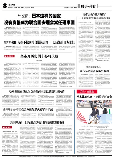 □新华社记者 日本首相高市早苗正以一种极其危险的方式,试图调转日本的船头,驶向历史的暗礁。 高市近期在国会发表的涉台谬论,绝非简单的“口误”或“失态”,而是一场以国家前途和地区和平为筹码,妄图打开潘多拉魔盒的政治豪赌。这不仅是对日本和平宪法的公然背叛,更是对中国内政的粗暴干涉和对战后国际秩序的蓄意挑衅。殷鉴不远,高市开历史倒车,必将走向失败的结局。 高市涉台错误言论之恶劣,创下了1945年日本战败以来日本领导人的多个“首次”:这是日本领导人首次在正式场合鼓吹所谓“台湾有事就是日本有事”并与行使集体自卫权相关联,首次在台湾问题上表达试图武装介入的野心,首次对中国发出武力威胁。这一涉台错误言论从根本上损害了中日关系的政治基础,激起了中国人民的公愤和谴责。 高市之举并非孤立的个人行为,其背后是日本国内一股企图为军国主义招魂、彻底摆脱战后体制束缚的右翼逆流。高市早苗之流心心念念的,绝非守护日本民众的和平安宁,而是以“外部威胁”为借口,为修改和平宪法、实现所谓军队“正常化”、重走“军事大国”的老路扫清障碍,台湾问题只是他们撬动这个危险议程的支点之一。他们刻意渲染危机,不惜将日本民众绑上以邻为壑的战车,其最终目的,就是要突破和平宪法,将战争怪兽释放出来。 和平的果实来之不易,日本民众并未被右翼逆流的企图所完全蒙蔽。高市的危险言论一出,便在日本国内激起了高度警惕和强烈反对的声浪。从最大在野党党首的严厉批评,到自民党内部资深议员的忧心忡忡,再到学者的痛心疾首和民众的愤怒抗议,凡此种种,无不说明日本社会仍存理性声音和守护和平的力量。“高市下台”“不得煽动战争”的呼声,正是日本民意对当政者将国家引向歧途的有力回击。 历史是一面镜子。上世纪那场由日本军国主义发动的侵略战争,不仅给亚洲各国人民带来了深重灾难,也让日本自身付出了惨痛代价,几乎陷入万劫不复的境地。战后日本之所以能够实现经济复苏与繁荣,根本在于其选择了和平发展之路,并向世界作出了“永不再战”的郑重承诺。这一承诺是日本重返国际社会的基石,也是其立足世界的根本保障。 如今,高市及其代表的右翼势力,正试图摧毁这一基石。他们对历史毫无敬畏之心,对战争的残酷选择性遗忘,妄图通过玩火来攫取政治私利。但他们必须明白,今天的中国早已不是百年前的中国,今天的世界格局也早已不同往日。任何人都不要低估中国人民捍卫国家主权和领土完整的坚强决心、坚定意志和强大能力。台湾问题是中国核心利益中的核心,是不可逾越的红线和底线。任何试图干涉中国内政、阻挠中国统一大业的行径,都必将遭到迎头痛击。 我们严肃敦促高市早苗及其政府,深刻反省历史,收回错误言论,停止在涉华问题上制造事端,以实际行动认错纠偏,维护中日关系政治基础。一意孤行,在错误的道路上越走越远,执意要与14亿多中国人民为敌,那么等待它的,必将是比80年前更为彻底的失败。 (新华社北京11月19日电)