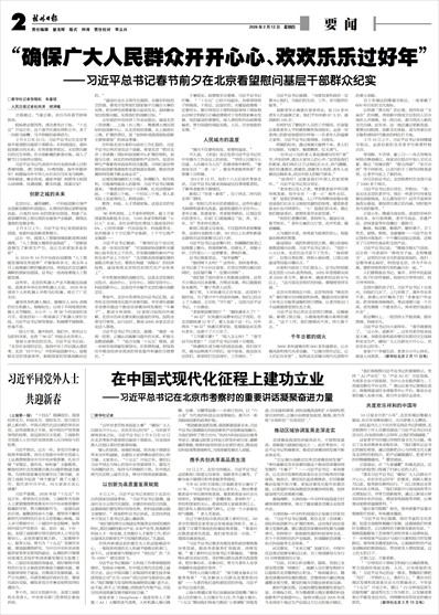 □新华社记者 “过年对老百姓来说是大事”“确保广大人民群众开开心心、欢欢乐乐过好年”,马年春节即将到来之际,习近平总书记2月9日至10日在北京考察并看望慰问基层干部群众,向全国各族人民致以美好的新春祝福。 暖心的话语,深情的祝福,给各地干部群众带来关怀和温暖,也激发大家拼搏奋进的信心和力量。大家表示,“十五五”开局之年,要在以习近平同志为核心的党中央坚强领导下,激发万马奔腾的活力,保持马不停蹄的干劲,在中国式现代化征程上建功立业,续写中国奇迹新篇章。 以创新为高质量发展赋能 9日上午,习近平总书记来到位于北京亦庄的国家信创园考察。“习近平总书记强调,建设社会主义现代化强国,关键在科技自立自强。这激励我们要发挥好自身优势,把科技创新这篇文章做好。”现场聆听总书记讲话,北京经济技术开发区工委书记孔磊心潮澎湃。 “我们要发挥亦庄制造业和服务业协同发展的特长,抓好战略性新兴产业、未来产业等,统筹教育科技人才一体发展,尤其做好人才服务工作,把亦庄建成北京新质生产力发展的典范区。”孔磊说。 在陕西省靖边县的爱生无人机试验测试中心,一架线条利落的无人机被平稳推出机库门。前不久,这架被誉为智能空中“货拉拉”的“天马-1000”刚完成首飞。 习近平总书记勉励广大科技工作者厚植报国情怀,发扬奋斗精神,在中国式现代化征程上建功立业。这让中国兵器工业集团西安爱生技术集团有限公司“天马-1000”项目总师马春浩信心满怀:“我们要聚力攻克特殊地域物资运输‘进不去、运不起、供不上’的难题,持续迭代升级产品,为低空经济高质量发展贡献科技力量。” 深度求索(DeepSeek)接连发布人工智能(AI)大模型迭代成果,人形机器人展示跳舞、出拳、空翻等技能……在浙江杭州,以“六小龙”为代表的科创企业成果频出,离不开一系列鼓励创新的政策护航。 “抓创新就是抓发展,谋创新就是谋未来。习近平总书记强调强化科技创新和产业创新深度融合,为我们指明了努力方向。”杭州市科技局局长楼秀华表示,要通过政策支持加大研发补助力度、破解融资难题,帮助科技型初创企业更好成长,推动前沿科技成果落地转化,为高质量发展注入动能。 携手共创共享高品质生活 10日上午,北京市西城区。习近平总书记走进新街口街道父母食堂、银龄老年公寓等,了解当地开展便民和养老服务等情况。 今年81岁的王国栋已在银龄老年公寓住了11年。“习近平总书记关心老年人,指出尊老敬老是中华民族传统美德,爱老助老是全社会共同责任,更勉励我们‘老骥伏枥、老有所为’。有党和国家的关心,看着祖国大家庭蒸蒸日上,我们老年人要活出精气神儿,让每一个小家庭也热气腾腾。”老人笑着说。 在辽宁省沈阳市铁西区重工新村社区,60多岁的周国忠家里床边安装着起身扶手、床上设置了可调节角度的防褥疮靠背器。“靠着社区推进适老化改造,我们家里没花一分钱。”周国忠满意地说。 “习近平总书记要求各级党委和政府要统筹各类资源,推动养老服务扩容提质、持续发展。”重工新村社区党委书记王斯楠说,“要继续从群众实际出发,及时响应群众适老化改造需求,把好事办实、实事办好,努力为老年人安享幸福晚年创造更好条件。” “坚持人民城市理念”“着力健全基本公共服务体系”“扎实解决人民群众急难愁盼问题”……为老百姓打造和谐宜居的环境,习近平总书记念兹在兹。 上海市黄浦区委书记徐惠丽深受鼓舞:“城市是人民的城市,人民城市为人民。作为超大城市,‘十五五’期间我们将着力推动‘小梁薄板’房屋改造、历史建筑修缮、消防设施改造和扩大保障性租赁住房供给,让城市治理更加高效、精细,助力百姓‘住有所居’‘住有宜居’。” 推动区域协调发展走深走实 京津冀是我国经济最具活力、开放程度最高、创新能力最强的地区之一。此次考察中,习近平总书记明确要求,推动京津冀协同发展不断走深走实。 “立足城市战略定位和京津冀协同发展”“牵住疏解北京非首都功能这个推动京津冀协同发展的‘牛鼻子’”……习近平总书记一系列要求,让北京市发展和改革委员会主任杨秀玲印象深刻。她表示,要切实扛起首都使命,打好疏解整治促提升组合拳,更加注重优化提升首都功能,以更强担当纵深推进京津冀协同发展,加快建设现代化首都都市圈。 渤海湾畔,天津滨海—中关村科技园着力打破体制机制壁垒,吸引了越来越多京冀企业投资兴业。 天津滨海—中关村科技园办公室副主任张钊说:“习近平总书记强调,抓住北京(京津冀)国际科技创新中心扩围的契机。这对我们而言是重大发展机遇,要以推进京津冀协同发展为战略牵引,培育吸引一批根植性强的科技领军企业、若干个具有特色的产业集群,形成辐射京津冀一站式科技服务生态体系。” 河北雄安,“未来之城”加速生长。中国中化总部迁驻雄安新区以来,员工杨高敏每天步行10分钟就能到办公室。 “目前,住房公积金缴存、提取、贷款已全面实现京雄‘同城化’,疏解人员在雄安购房可以提取在北京缴纳的公积金。”杨高敏表示,随着京津冀协同发展的推进,京雄快线开通后两地通勤会更方便,雄安的城市功能也将更加完善。 新时代新征程,区域协调发展重要性更加凸显。在南海之滨,作为粤港