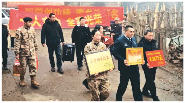 本报讯(通讯员张明箭 文/摄)锣鼓喧天传捷报,军功荣耀进家门。近日,由县人武部、县退役军人事务局及属地乡退役军人服务站组成的送喜报队伍,为东山瑶族乡4名荣立个人三等功的现役军人家庭送上喜报、慰问金与荣誉绶带,把部队的褒奖和政府的关怀送到军属心坎上。
