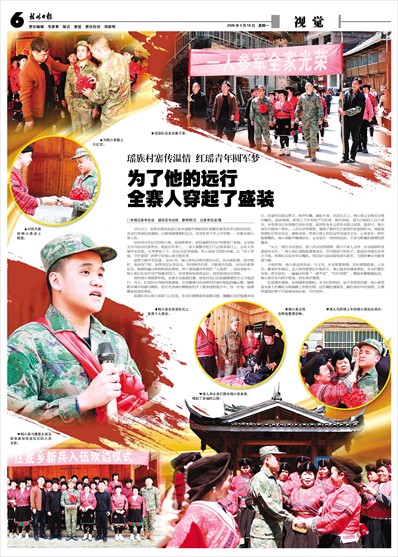3月12日,龙胜各族自治县江底乡建新村矮岭组红瑶聚居寨里欢声与热泪交织,乡亲们身着红瑶盛装,以寨里最隆重的仪式,欢送乡里今年上半年唯一一名新兵杨小弟入伍。