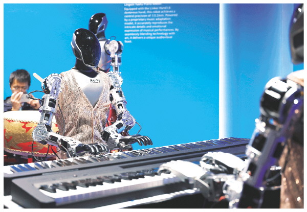 3月24日,在中关村论坛年会新闻中心内,人形机器人在演奏音乐。
