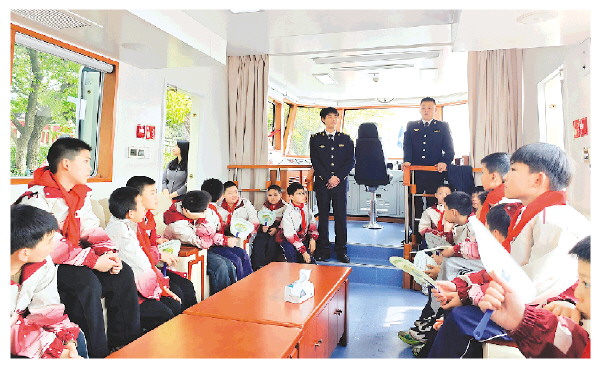 师生参观广西首艘纯电动执法船“海巡10765”,感受无废理念在交通运输领域的生动实践。