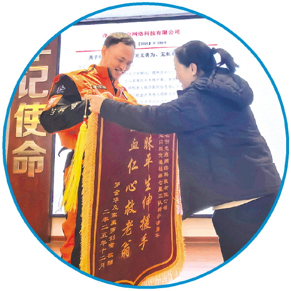 ◤外卖骑手徐勇平(左)收到老人家属赠送的锦旗。