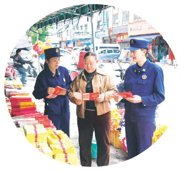 在象山区,消防救援人员联合网格员、志愿者针对清明祭祖用品销售场所开展防火宣传。