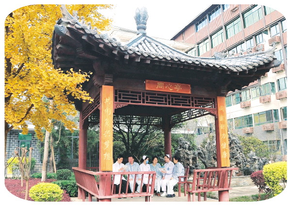 同心亭:亭中共话 医患同心 叠石假山瀑布旁,一座飞檐翘角的同心亭静静矗立,朱红与黛青的色调交织,既显传统建筑的庄重典雅,又透着几分温润的暖意,仿佛是从山水间自然生长出来的休憩之所。每到傍晚,同心亭里总是暖意融融、热闹非凡。医护人员与患者们围坐在一起,聊聊饮食起居的细节,分享康复路上的心得,宛如亲友间闲话家常。 偶尔,这里还会举办“健康经验分享会”。大家各抒己见,畅谈康复故事、交流养生妙招,也坦诚倾诉就医过程中的困惑与需求。在这个小小的亭子里,医患之间的隔阂悄然消融,只剩下家人般的温暖与信任,这里也成了医院里的“暖心驿站”。