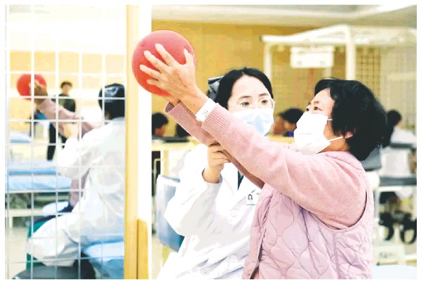3月25日,在山东日照市康复医院,医护人员协助老人做康复训练。新华社记者郭绪雷 摄