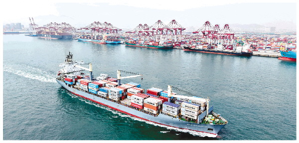 4月14日,在山东港口青岛港,装载外贸集装箱的货轮驶离港口(无人机照片)。新华社发(俞方平摄)